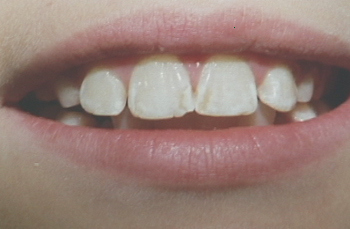 Noticeable yellow / opaque staining on your teeth? Maybey side-effects from long-term antibiotic abuse? Or perhaps you were consuming fluoride as a child? If you can find a honest dentist, and you wnat to know the cause of your disfigurement, he will tell you the truth. But if your dentist is pro-fluoride (everything), then he may wish to skirt around the issue and tell you there is nothing to be worried about.