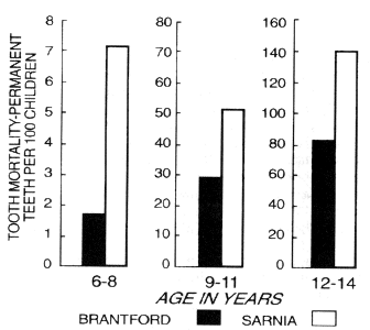 The influence of treatment.The fact that such large differences were reported in tooth mortality rates in the two cities even in the older age groups suggests that dental treatment in them was different, and the authors stated that "Both preventive and treatment measures may have a decided effect on tooth mortality rates" (Brown et al., 1953). It may be recalled that the United Kingdom Mission (1953) noted that Brantford was unusually well provided with free dental services "and this has resulted in the ratio of corrected to total defects being higher than in either Sarnia or Stratford."